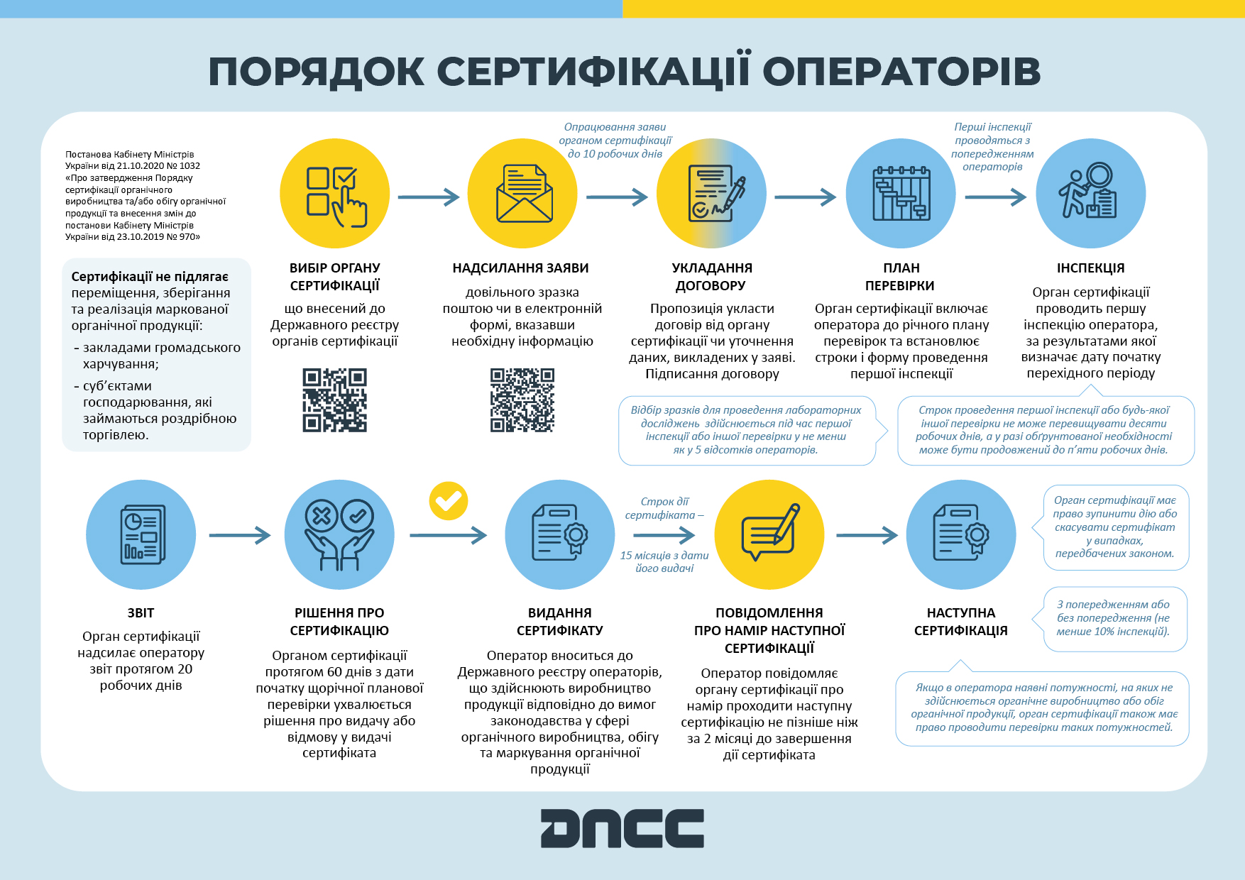 Процес сертифікації. Процес сертифікації розпочинається з дати підписання договору на проведення сертифікації між органом сертифікації і особою. Особа, яка уклала договір з органом сертифікації, стає оператором та вноситься Міністерства економіки, довкілля та сільського господарства України (Мінекономіки) до Державного реєстру операторів, що здійснюють виробництво продукції відповідно до вимог законодавства у сфері органічного виробництва, обігу та маркування органічної продукції протягом 10 днів з дня отримання ним відповідної інформації від органу сертифікації.