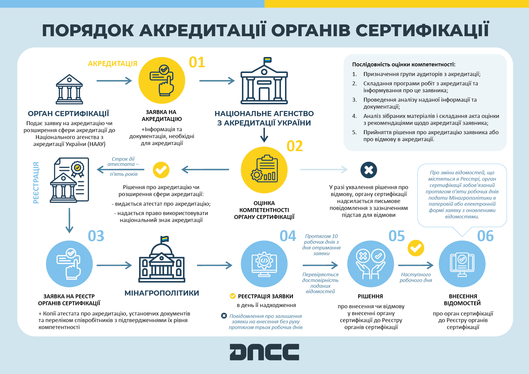 Далі НААУ на підставі заявки органу сертифікації оцінює його компетентність за наступною послідовністю: