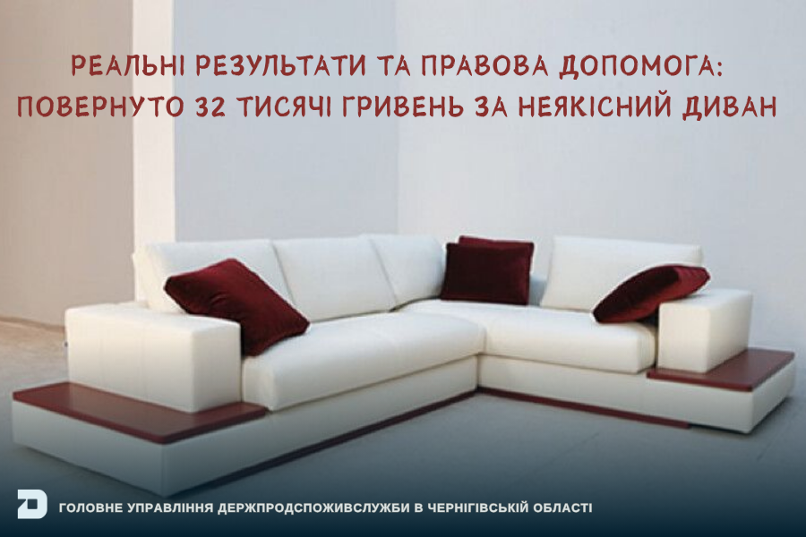 Так, до Головного управління надійшло звернення від споживача щодо повернення коштів за неякісний товар – м’який кутовий диван. Після отримання роз’яснень у центрі «Громадська приймальня» щодо прав споживача у разі придбання товару неналежної якості, суб’єкт господарювання повернув заявнику кошти в розмірі 32 тис. грн.