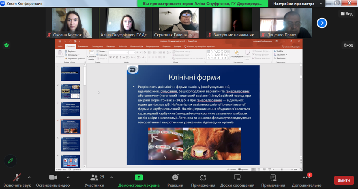 21 листопада відбувся навчальний семінар на тему: «Заходи при підозрі на сибірку та заходи щодо ліквідації захворювання», організований управлінням безпечності харчових продуктів та ветеринарної медицини Головного управління Держпродспоживслужби в Херсонській області.