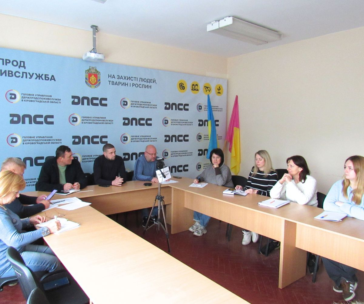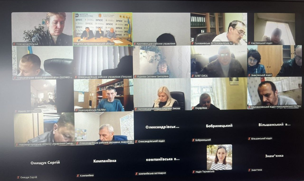 До заходу долучилися в.о. першого заступника начальника Руслан Крайносвіт, керівник Кіровоградської філії ДП «Агенство з ідентифікації і реєстрації тварин» Едуард Скрипкін, спеціалісти управління безпечності харчових продуктів та ветеринарної медицини, а також у режимі відеоконференції - фахівці районних управлінь Держпродспоживслужби області та районних державних лікарень ветеринарної медицини.