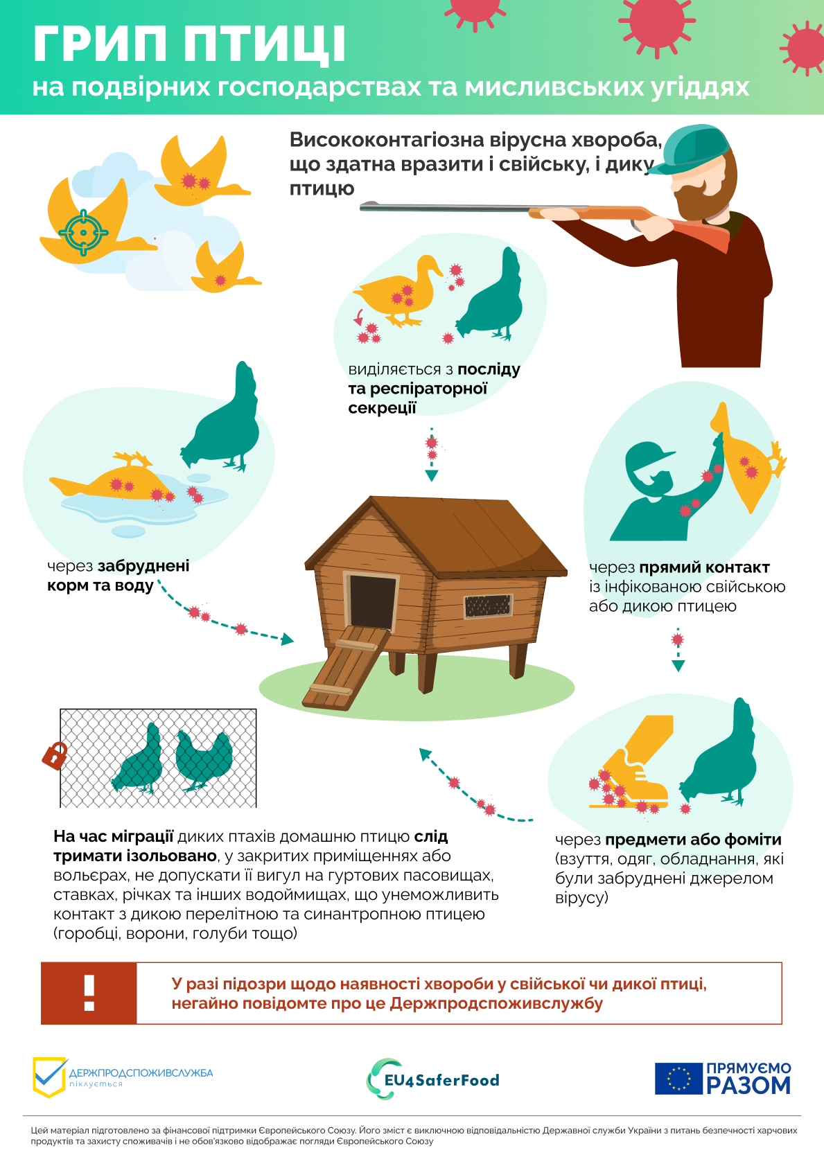 - Не допускайте контакту домашньої птиці з дикими, особливо водоплавними, та синантропними птахами.