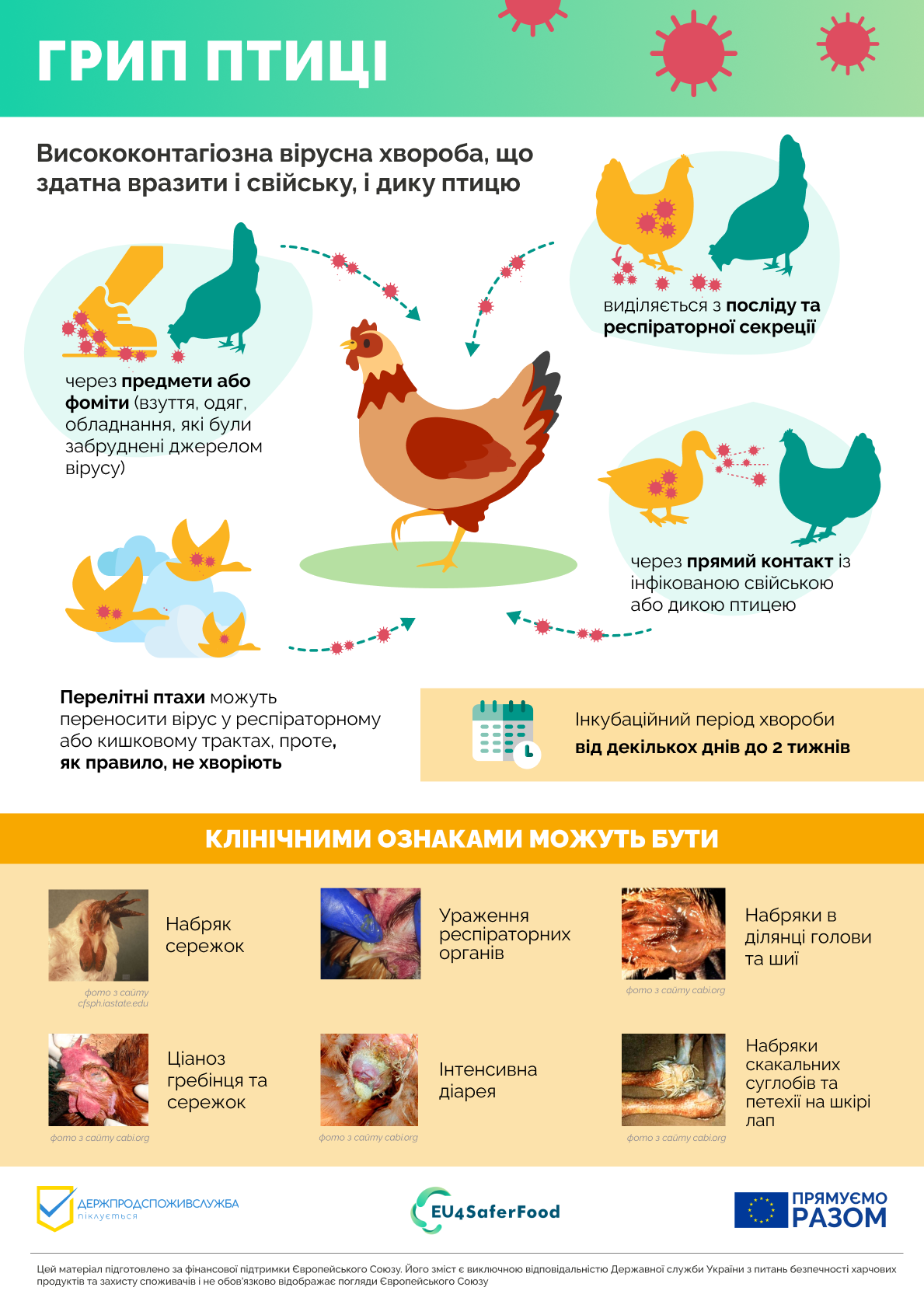 Детальніше про клінічні ознаки грипу птиці та про шляхи його передачі – в інфографіці, розробленій спільно з європейським проєктом EU4SaferFood