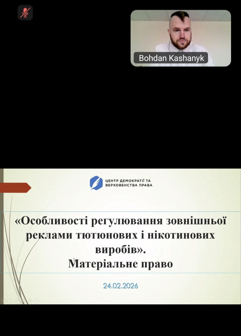 Освітній семінар «Особливості регулювання зовнішньої реклами тютюнових і нікотинових виробів» було організовано у форматі онлайн-конференції за участю державних інспекторів та експертів у сфері права.