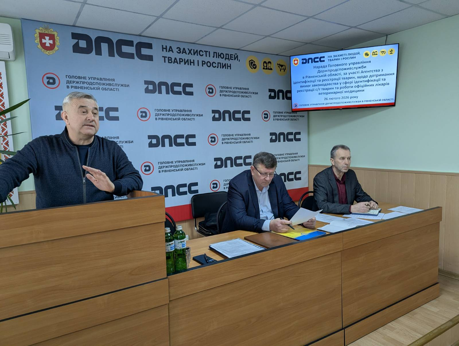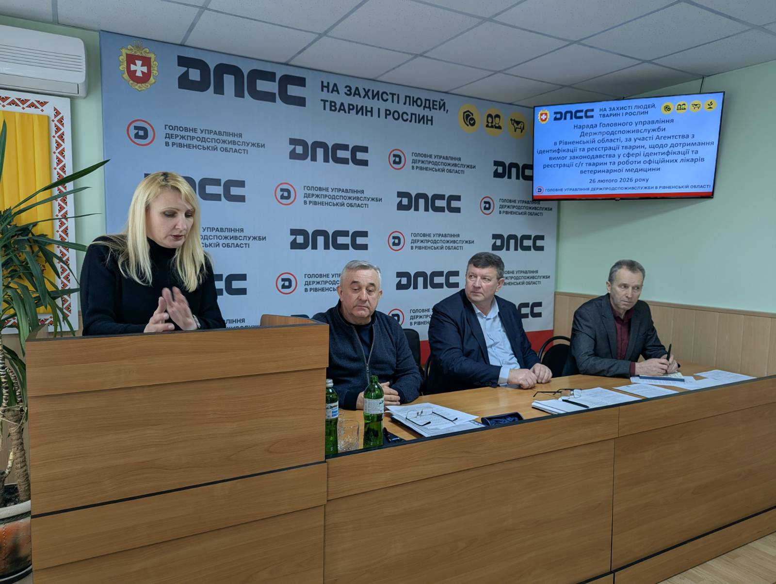 Нараду проведено в Головному управлінні Держпродспоживслужби в Рівненській області за участі директора Петра Пешка та спеціалістів ДП «Агентство з ідентифікації і реєстрації тварин», спеціалістів Рівненської філії, начальників районних управлінь та лікарень, офіційних лікарів районних державних лікарень ветеринарної медицини, які здійснюють державний ветеринарний контроль на підприємствах по забою сільськогосподарських тварин.