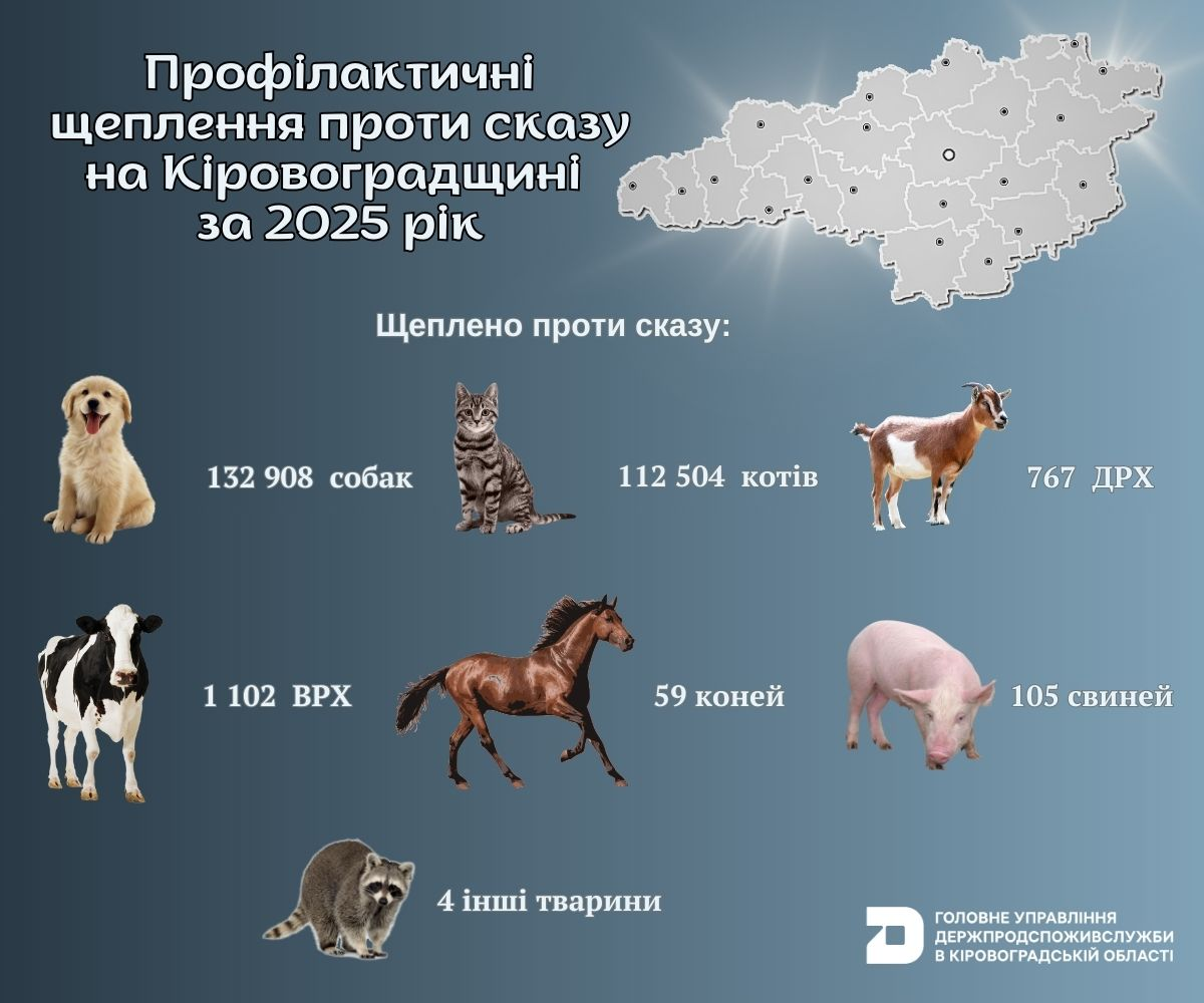 За грудень минулого року лабораторно підтверджено 21 випадок сказу серед тварин, зокрема: 16 лисиць, 3 котів, 1 собаки та 1 голови великої рогатої худоби. Найбільшу кількість випадків виявлено в Кропивницькому районі - 13, у Голованівському – 6 та по одному випадку зафіксовано в Олександрійському і Новоукраїнському районах.