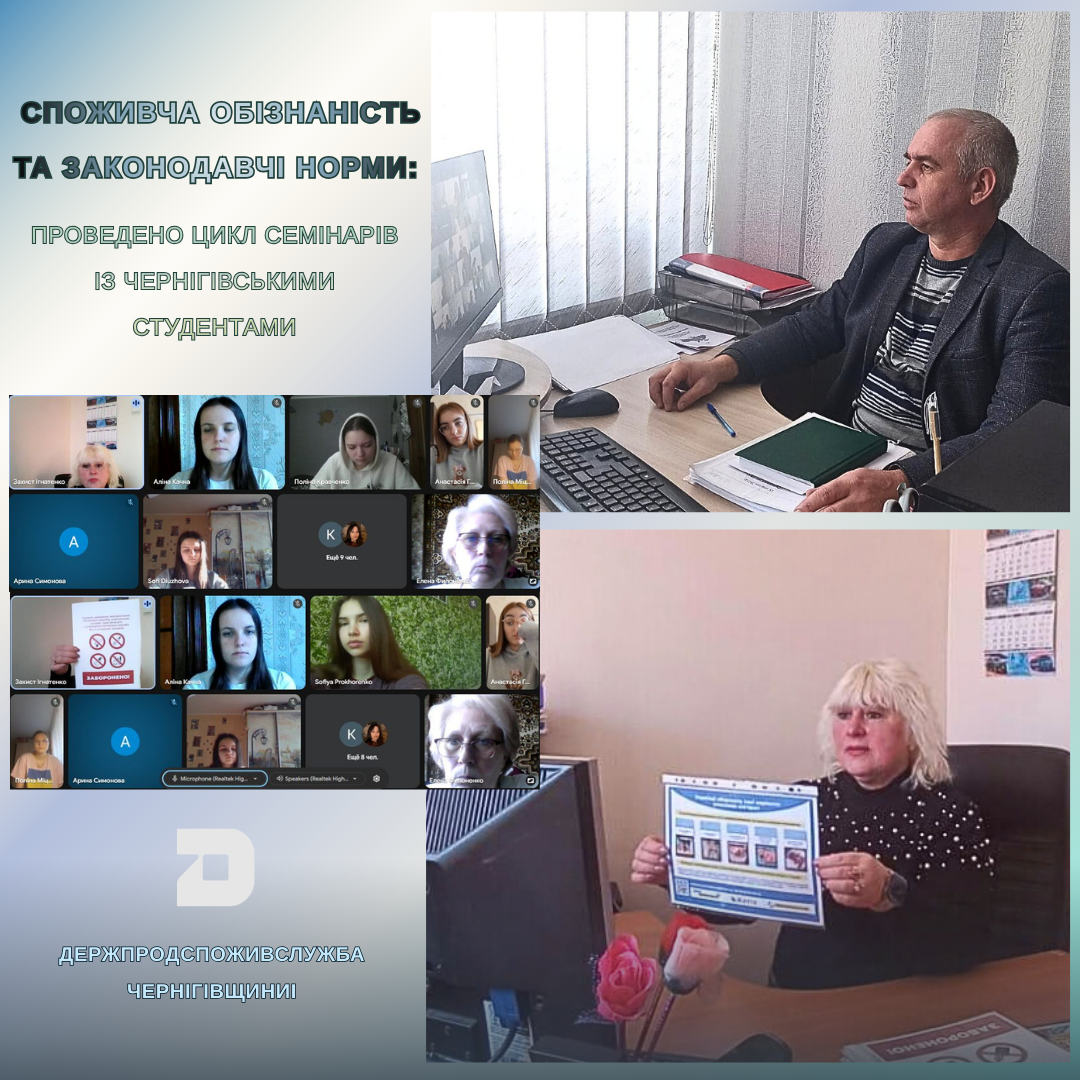 Протягом 10-11 березня фахівці Управління захисту прав споживачів Головного управління Держпродспоживслужби в Чернігівській області провели онлайн-семінари для студентів Чернігівського кооперативного фахового коледжу Чернігівської облспоживспілки та Відокремленого структурного підрозділу «Фаховий коледж економіки і технологій НУ «Чернігівська політехніка»». Просвітницька робота була спрямована на те, щоб підвищити рівень споживчої грамотності молоді, перетворити теоретичні знання на практичні інструменти захисту своїх прав та інтересів на споживчому ринку.