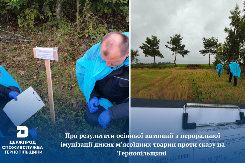 Головне управління Держпродспоживслужби в Тернопільській області інформує, що в період з 29 вересня по 3 жовтня 2025 року на території 55 територіальних громад області відбулася осіння кампанія з пероральної імунізації диких м’ясоїдних тварин проти сказу.