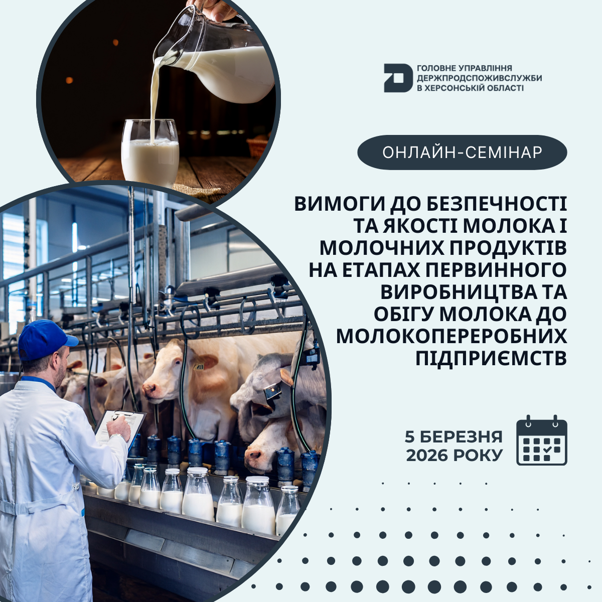 Україна послідовно зміцнює систему контролю безпечності молочної продукції. З цією метою управління безпечності харчових продуктів та ветеринарної медицини спільно з Бериславським районним управлінням Головного управління Держпродспоживслужби в Херсонській області провели тематичний онлайн-семінар «Вимоги до безпечності та якості молока і молочних продуктів на етапах первинного виробництва та обігу молока до молокопереробних підприємств».