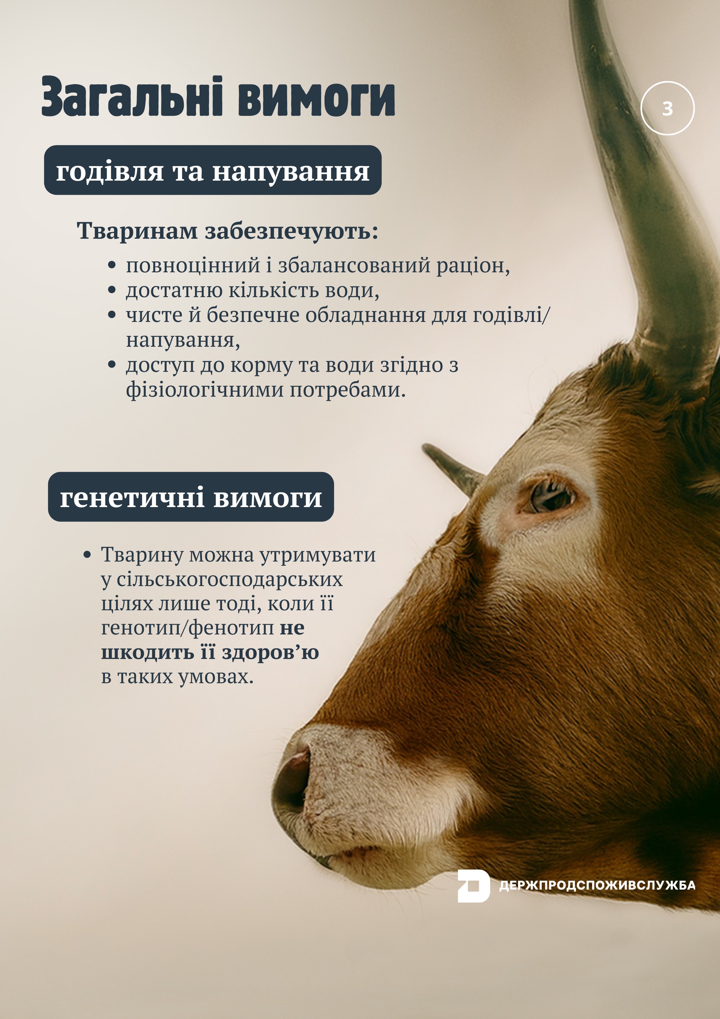 Вже з 1 січня 2026 року відповідно до наказу Міністерства розвитку економіки, торгівлі та сільського господарства України від 08.02.2021 № 224 будуть введенні в дію вимоги до благополуччя сільськогосподарських тварин під час утримання і будуть обов’язковими до виконання всіма операторами ринку. В свою чергу вимоги щодо благополуччя тварин під час умертвіння та транспортування почнуть діяти з березня 2026 року.