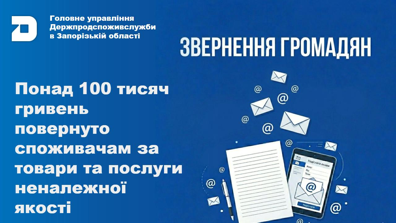 За результатами здійснених заходів Головним управлінням Держпродспоживслужби в Запорізькій області в ході розгляду звернень, суб’єкти господарювання споживачам повернули понад 100 тис. грн за неякісні товари або послуги. Зокрема були повернуті кошти за генератори, зарядні станції, одяг, взуття та інші товари та послуги.