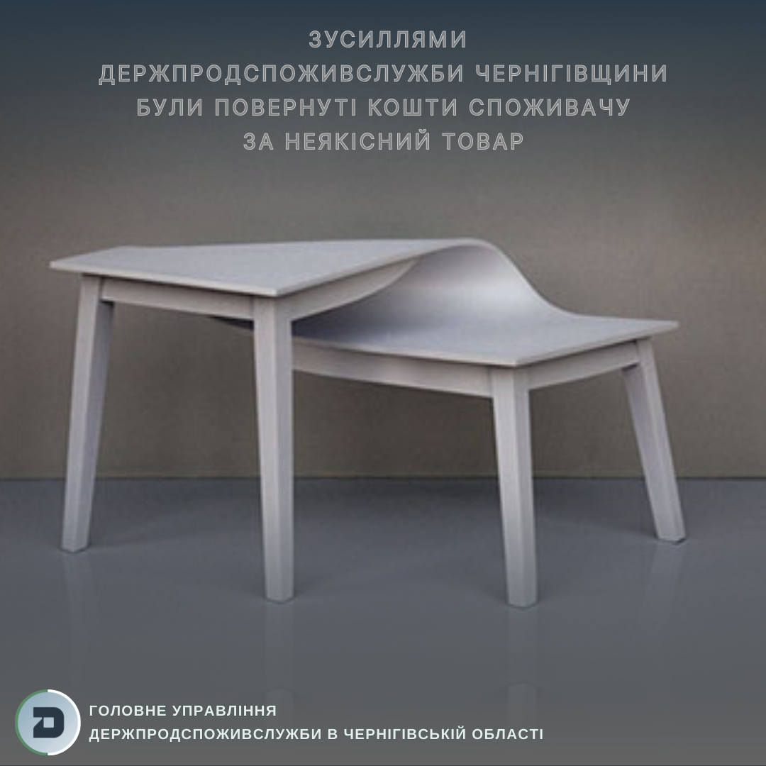 Управлінням захисту прав споживачів Головного управління Держпродспоживслужби в Чернігівській області постійно здійснюється державний нагляд за дотриманням законодавства у сфері захисту прав споживачів, в тому числі з питань щодо недопущення порушень при реалізації неякісного товару. До Головного управління надійшло звернення споживача М. стосовно відмови підприємця у реалізації його законних прав щодо проведення гарантійного ремонту чи заміни неякісного товару (меблі). Після надання консультації центром «Громадська приймальня» щодо прав споживача при придбані товару неналежної якості підприємцем були повернуті кошти споживачу за неякісний товар в сумі 11 тис 700 грн.